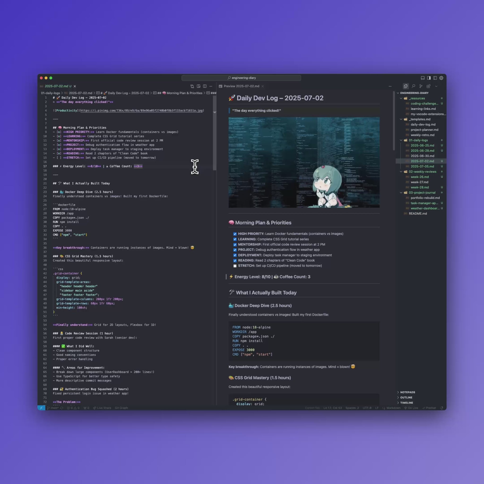 Engineering Diary helps you stay focused, track progress, and grow your skills — using only VSCode and markdown files.
